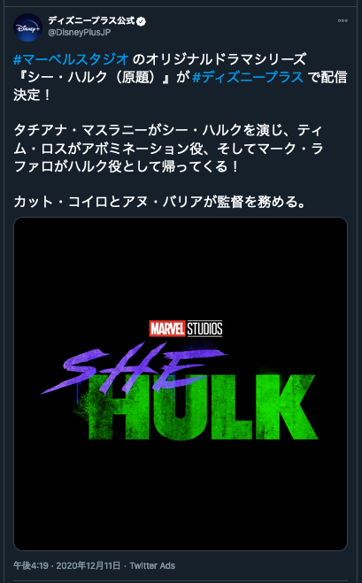 弁護士兼ハルクの主人公のジェニファー・ウォルターズを『オーファン・ブラック』のタチアナ・マスラニーが演じ、ブルース・バナー/ハルクのマーク・ラファロの出演も発表。ディズニー+で配信予定。