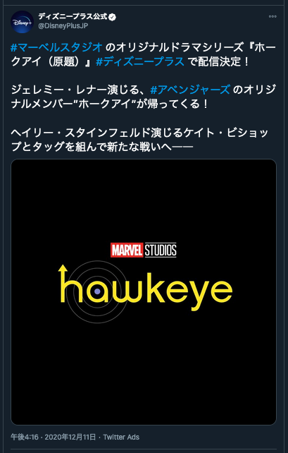 ジェレミー・レナーがホークアイとして出演するだけでなく、新ホークアイのケイト・ビショップ役としてヘイリー・スタインフェルドが出演のドラマ。こちらもディズニー+で配信予定。