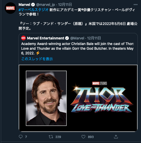 クリスチャン・ベールがヴィラン役として出演。宇宙の神々を殺し続けるゴール・ザ・ゴッドブッチャー役。 2022年5月6日公開予定。