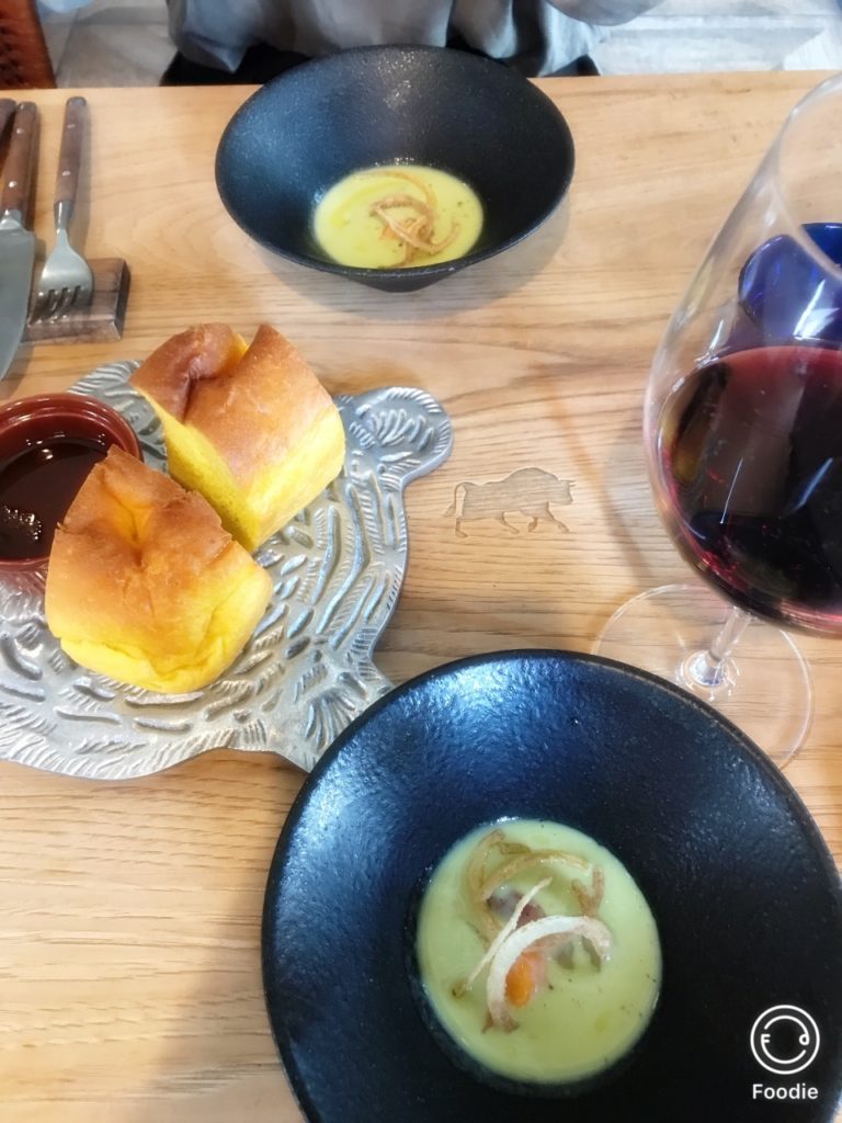 まず、スープとカボチャのフォカッチャ。