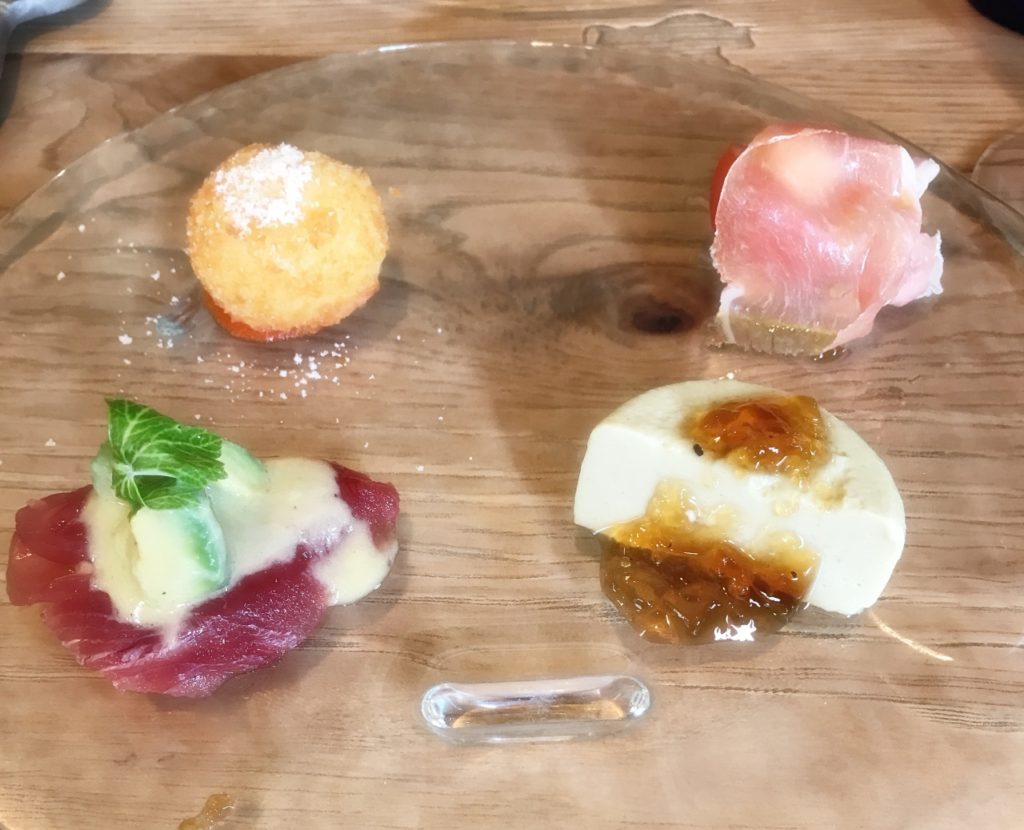 右上:フルーツトマトにチーズと生ハム、左上:チーズリゾットコロッケ