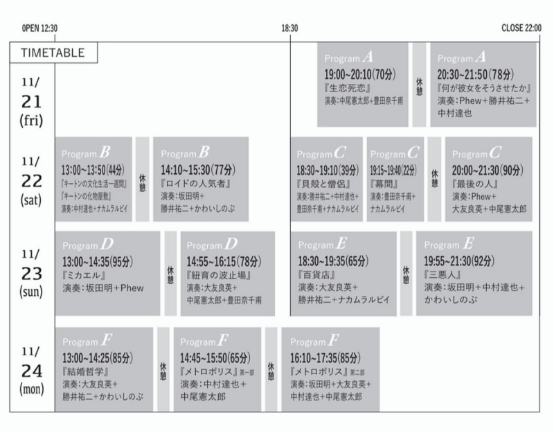 演奏:中村達也(ドラムス)、中尾憲太郎(ベース)、大友良英(ギター)、坂田明(サックス/クラリネット他)