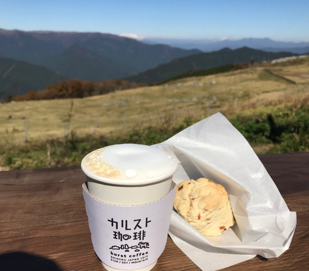 山々を眺めながら寛ぎの一杯、高原牛乳カフェオレとラムレーズンスコーンで一息
